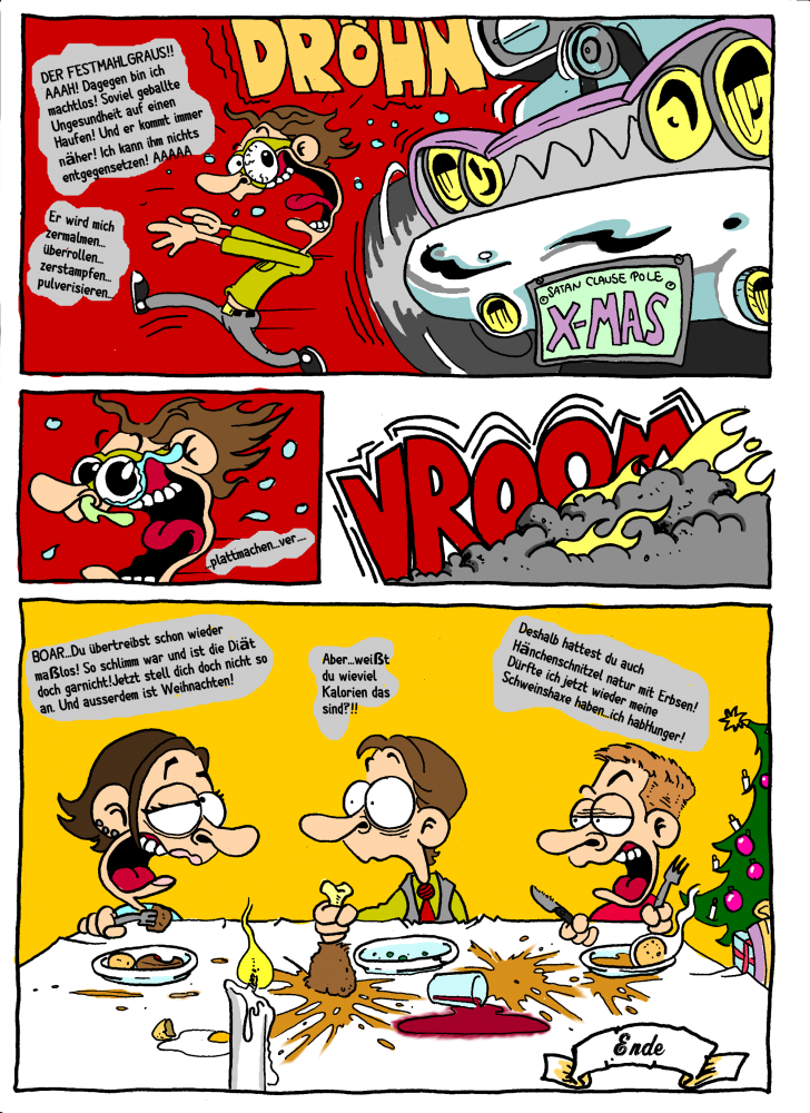 Allerdings erinnert mich der FieseFettzellenFreddie (cooler Name,by the way!) ziemlich stark an den Batman-Gegenspieler Clayface und beim Festmahlgraus hast du dich wohl von Jimbo Phillips inspirieren lassen. Ist mir halt nur aufgefallen,tut dem Gesamteindruck aber keinen Abbruch.