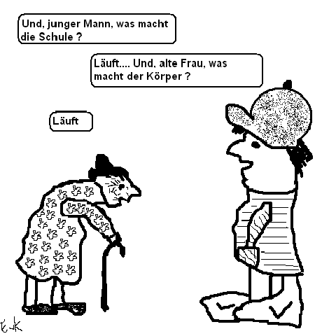 Schlagfertig und frech der Bursche. Kommt wieder mit diesem leisen Humor einher, der eigentlich in seiner Ur-Essenz brüllig ist bzw. sein kann, wenn man weiteren Überbau hinzubastelt. (Ist aber gar nicht nötig eigentlich, es rutscht auch so schon.)