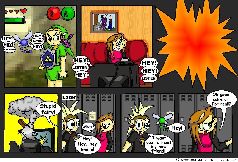 Ok hey! I LOVE Zelda! This sketch isn't me saying Zelda games suck, not at all. This is me just taking notice of the one pile of crap, that is Navi, in the game. Navi if not controlled would scream and yell 'HEY' until you clicked the yellow up button and the worst thing was was that she just pointed out the obvious and you had to read through the most pointless things. "Hey look a cloud is over Death Mountain!" No shit Navi, thats why we are going there!! Anyways sometimes I just wanted to punch the shit out of my TV, luckily that is what I have Emilia for. Thanks Emilia.
