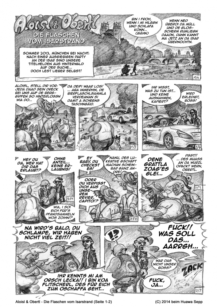 Hier gibt's nun nochmal eine überarbeitete Scribble mit meinen Protagonisten Aloisl & Obertl zum Thema "München bei Nacht", diesmal unter neuem Titel "Die Flaschen vom Isarstrand".