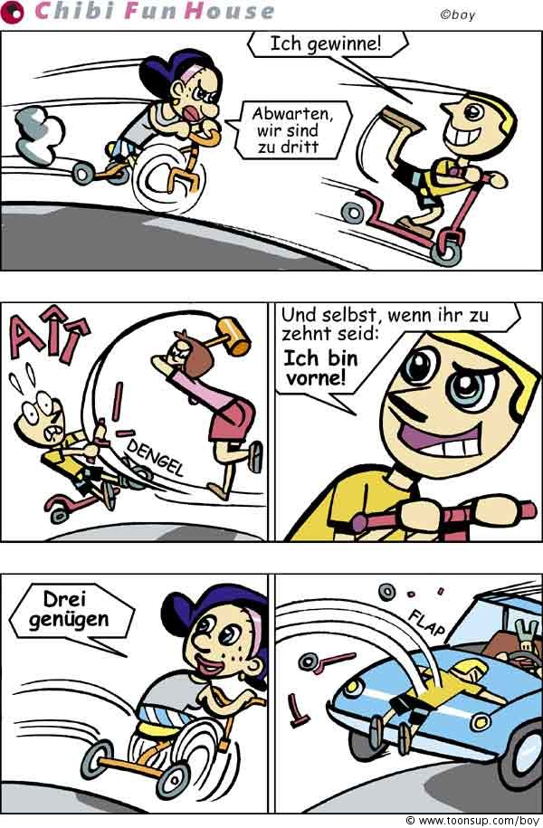 Merci Leute für die Kommentare und die freundliche Beachtung, undja, ich weiss um die Probleme einer Serie, es tauchen Figuren auf die in einer vorigen Folge schon charakterisiert wurden. Soll ja insgesamt mal ein Buch werden mit den immer gleichen (aber wenigen) Personen. Hier in dieser Folge ist es die 3Girls-Gang, die im Wettbewerb mit dem "boy" sind. Eins der 3 Girls verfügt hier über einen Krocket-Schläger die andere kann praktischerweise schon autofahren und greift mit der Familienkutsche in das Geschehen ein. Logischerweise gewinnt in so einem Fall die Girlsgang. Jemand der überhauptkeine andere Folge Folge im Hinterkopf hat, hat leider nur das halbe Vergnügen, ich kanns leider-leider nicht ändern. PS. Es gibt noch zusätzliche Folgen in meiner Galerie. :-)