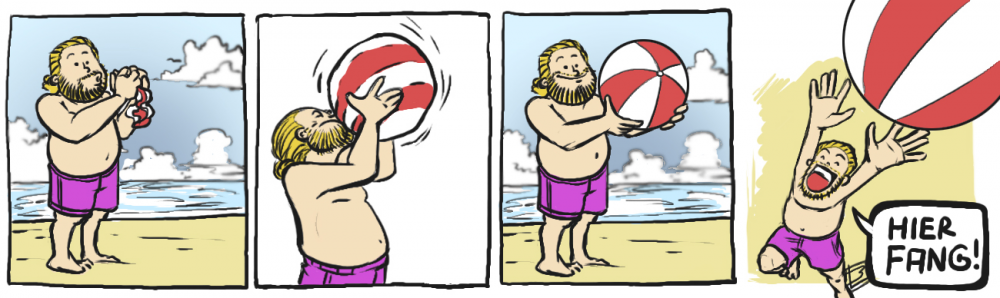 Super Badehose, Little Buddha. Das gefällt mir, aber der cartoon macht mich auch ein bisschen traurig, weil ich meine Tochter vermisse, die sich gerade so weit weg auf der Welt herumtreibt wie es geht und da wahrscheinlich auch an so einen Strand geht.