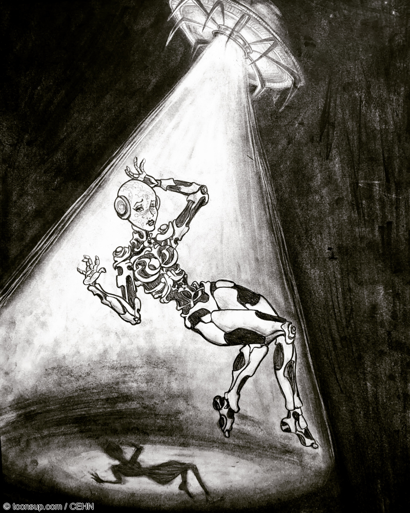 Der Plan ist eine total entrückte KI Dame wird vom Ufo hochgebeamt.
